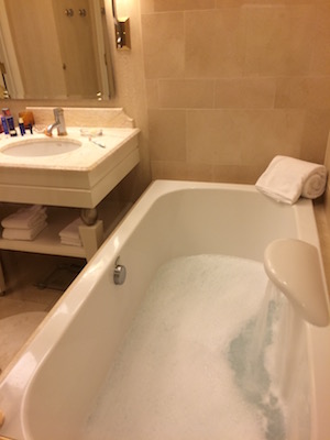 – comme il y a 5 ans, je décide de me faire un bon bain dans la luxueuse salle de bain de notre chambre. C’est le pied, en regardant la télé !
