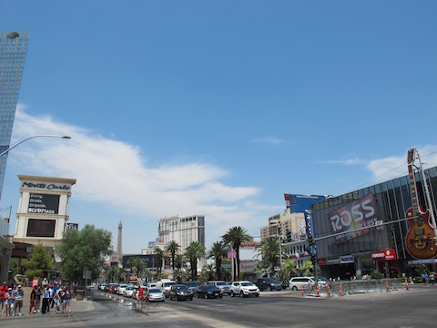 La partie nord du Strip est en travaux, la chaussée est rétrécie en raison de la démolition de l’hôtel Riviera. Je remarque aussi que le projet Resort World n’a guère avancé :
